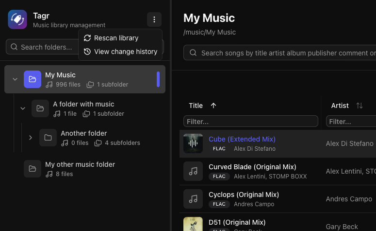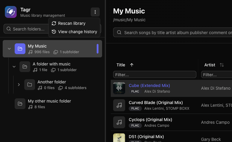 Self-hosted web app for browsing, playing, and editing music file metadata. Features a three-panel UI to navigate your library, listen to tracks, and write tag changes directly back to audio files. Built with Next.js, React, Prisma + SQLite, and node-taglib-sharp.