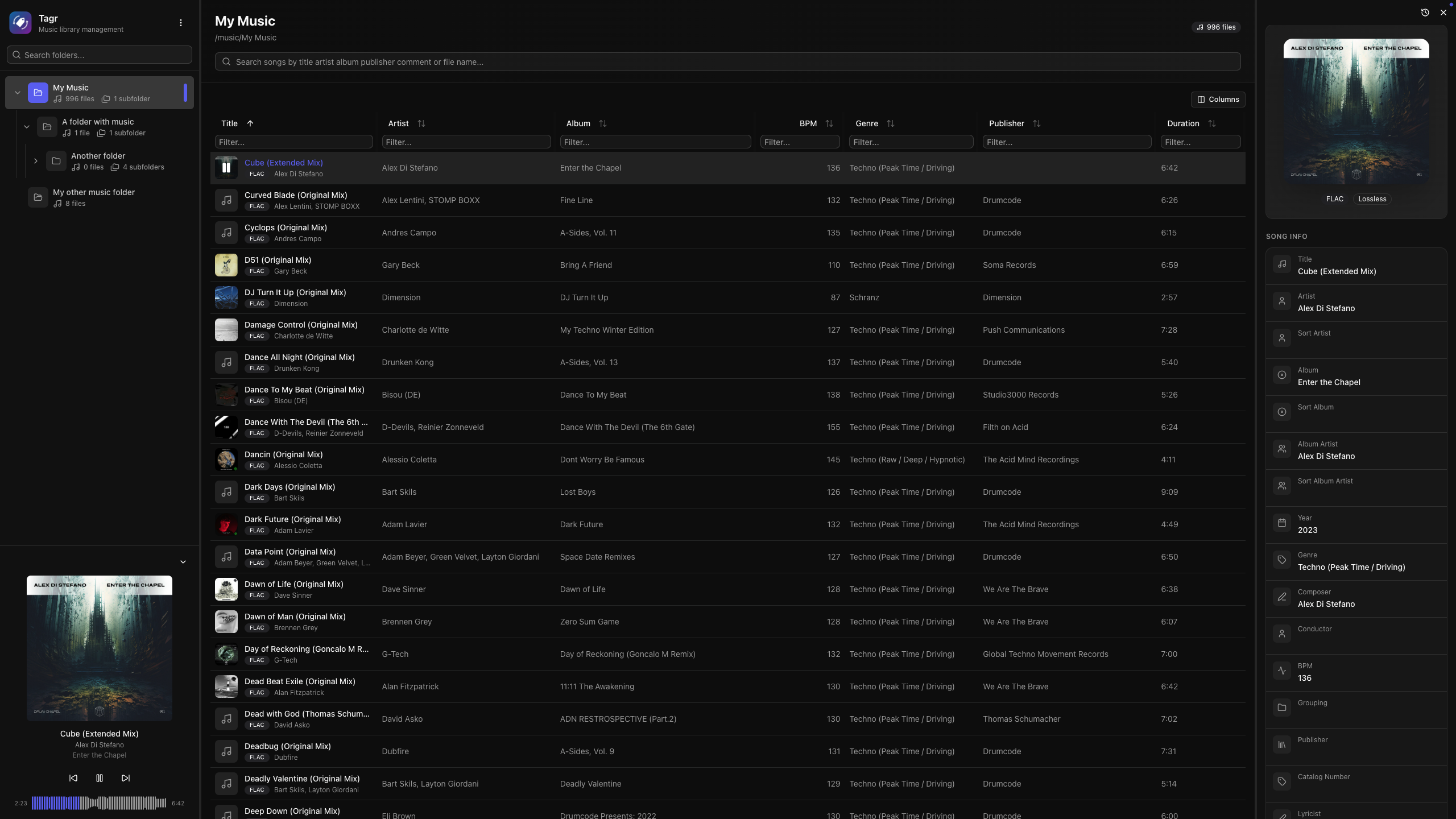 - Edit 40+ metadata fields inline β title, artist, album, year, genre, composer, BPM, lyrics, and more
