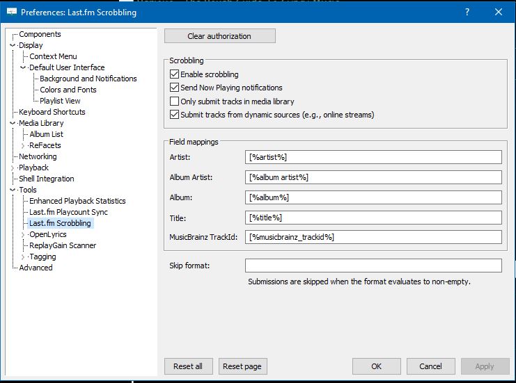 Preferences: Last.fm Scrobbling – Clear authorization