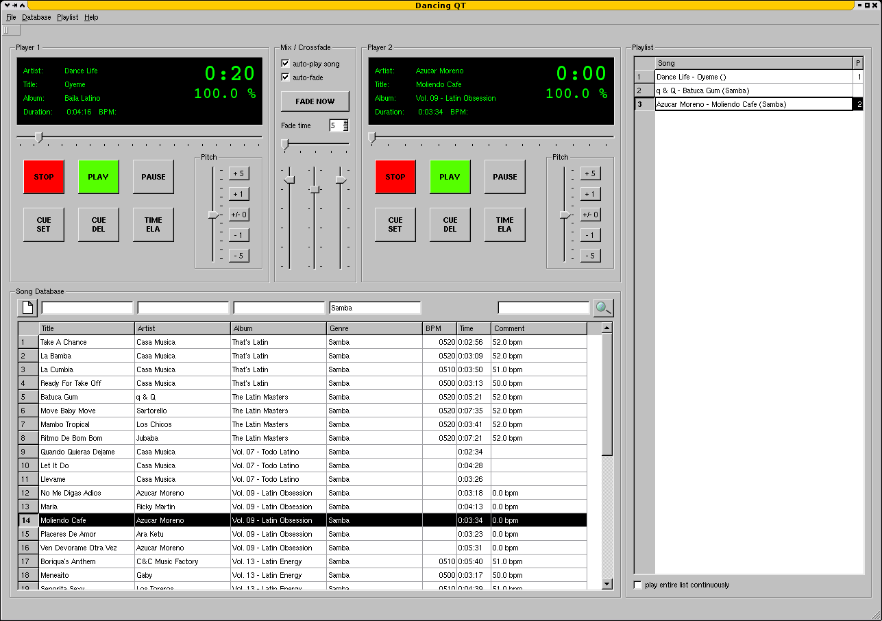 Dancing QT is a combined music database and player application specially designed for dancing schools and equivalent applications. Key features are an easy-to-use interface, fast search capabilities, playlist management, exact pitching and crossfading.