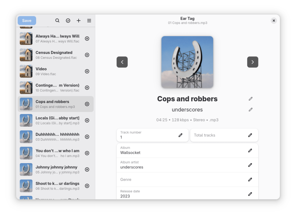Ear Tag is a simple audio file tag editor. It is primarily geared towards making quick edits or bulk-editing tracks in albums/EPs. Unlike other tagging programs, Ear Tag does not require the user to set up a music library folder. It can: