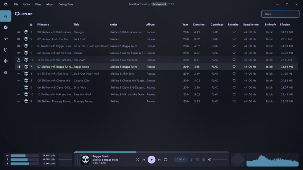 Amethyst is an cross-platform audio player with a node-basedaudio routing system, the main goal of this project is to make a music player in TypeScript to see how far the language can be stretched to prove it’s possible to provide pro-level features as most DAWs / DAEs, while also providing useful tools and customizability to the end-user.