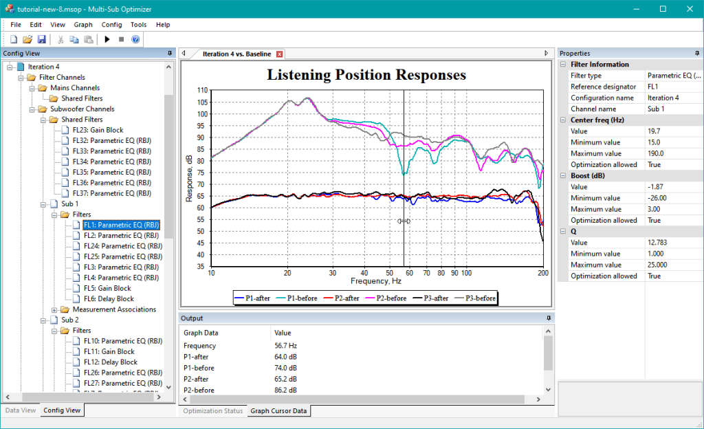 Although it’s possible to use it for identical equalization (EQ) of all subs at once, it does not depend on a global EQ approach like commercial room correction systems do. Such systems cannot reduce the seat-to-seat variation of the bass response. Instead, MSO performs optimization of EQ, gain and delay parameters individually for each subwoofer. This individual EQ optimization for each sub causes the variation of the bass response from seat to seat to be reduced, and the bass response at each listening position to be flattened.
