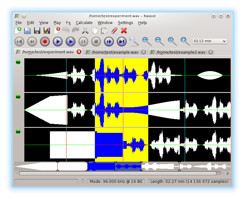 Kwave is a sound editor for the KDE environment. It is written with KDE/QT and is extendable through a powerful plugin interface. For the moment it supports .wav files and many other formats, recording/playback via PulseAudio, Qt Multimedia, OSS and ALSA and some simple effects.