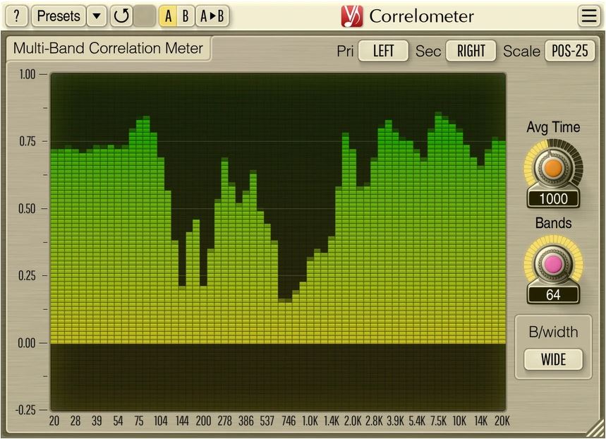 Correlometer can display 4 to 64 individual spectral bands, with adjustable band quality factor that controls the degree of band’s selectivity. Averaging time of correlation estimator can be adjusted. Correlometer supports side-chain inputs for easy correlation estimation between separate audio tracks.