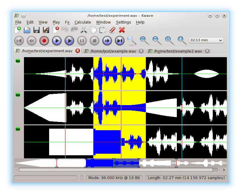 Kwave is a sound editor for the KDE environment. It is written with KDE/QT and is extendable through a powerful plugin interface. For the moment it supports .wav files and many other formats, recording/playback via PulseAudio, Qt Multimedia, OSS and ALSA and some simple effects.