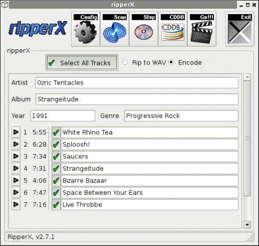 RipperX is a GTK program to rip CD audio tracks and encode them to the Ogg, MP3, or FLAC formats. It’s goal is to be easy to use, requiring only a few mouse clicks to convert an entire album. It supports CDDB lookups for album and track information.
