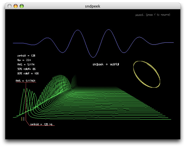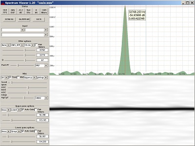 Reads audio from Windows audio interface or wave file and creates a continuous spectrum display. Command line support for generating sine, square, triangle and sawtooth wave files. Uses biquad IIR digital filters for frequency detection, plus digital lowpass filters for smoothing. Highly configurable. 60+ FPS with suitable hardware. Manual or automatic gain control.