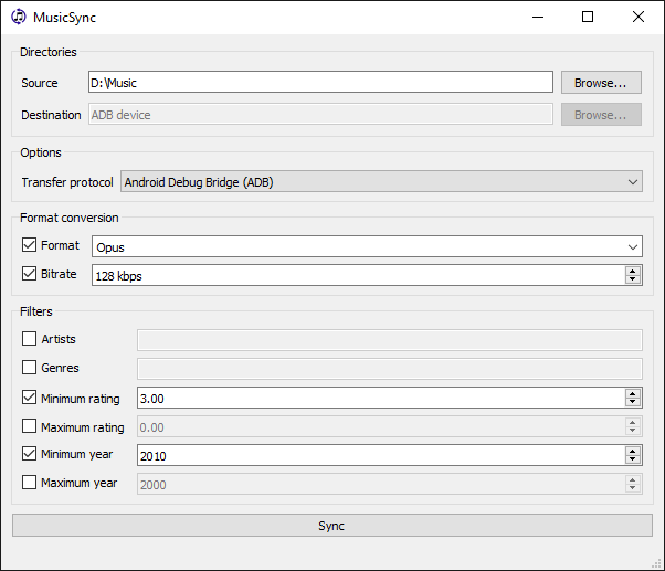 python musicsync D:/Music sdcard/Music --adb --min-rating 4.5 --output-format opus --output-bitrate 128k python musicsync D:/Music sdcard/Music --adb --min-rating 3 --min-year 2020 --output-format opus --output-bitrate