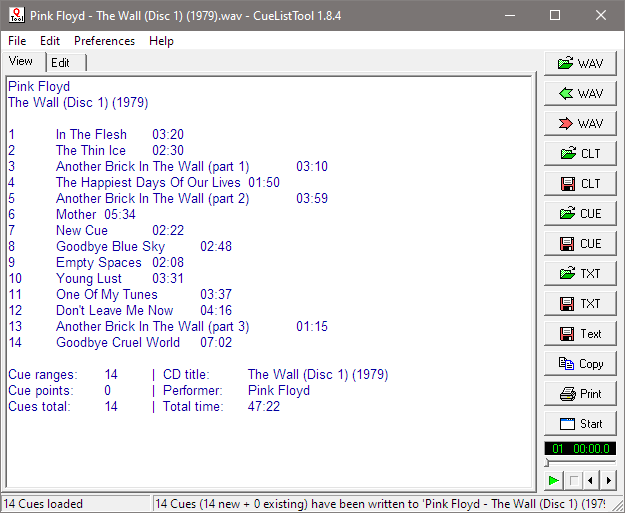 This utility allows you, among other things, to read, edit, and write back the cue lists embedded in WAV files by audio editing programs such as Adobe Audition. Cue lists can be saved as small text files and shared with other users.