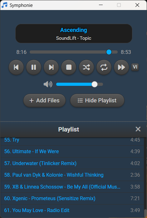 Symphonie is a sleek, lightweight desktop music player built with Electron and powered by HTML5 capabilities, offering a clean interface for enjoying your local audio library. It supports popular formats including MP3, FLAC, AAC, M4A, OGG, WAV, OPUS. Features include playlist management, intuitive playback controls, track metadata display (title/artist), and shuffle functionality for a seamless listening experience.