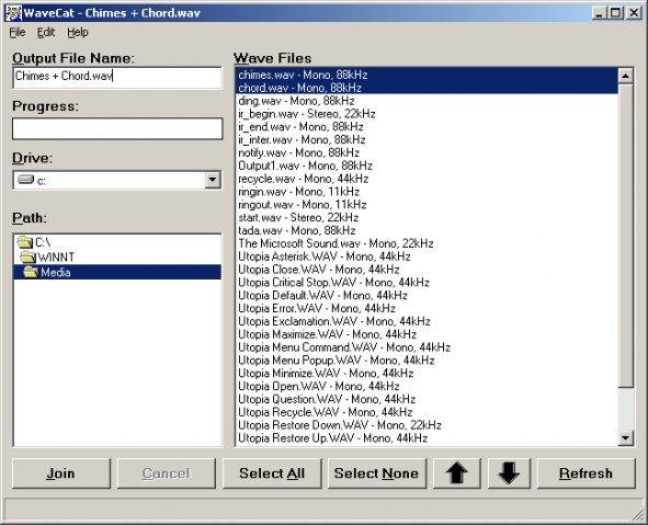Joins one or more WAV files together. If you rip a five CD book on tape, you’ll have a cluttered mess of about sixty audio files. WaveCat can turn your sixty files into one convenient large wav file. Suggestion: CDex –> WaveCat –> WinLame –> Single MP3 file.